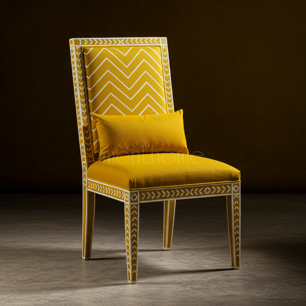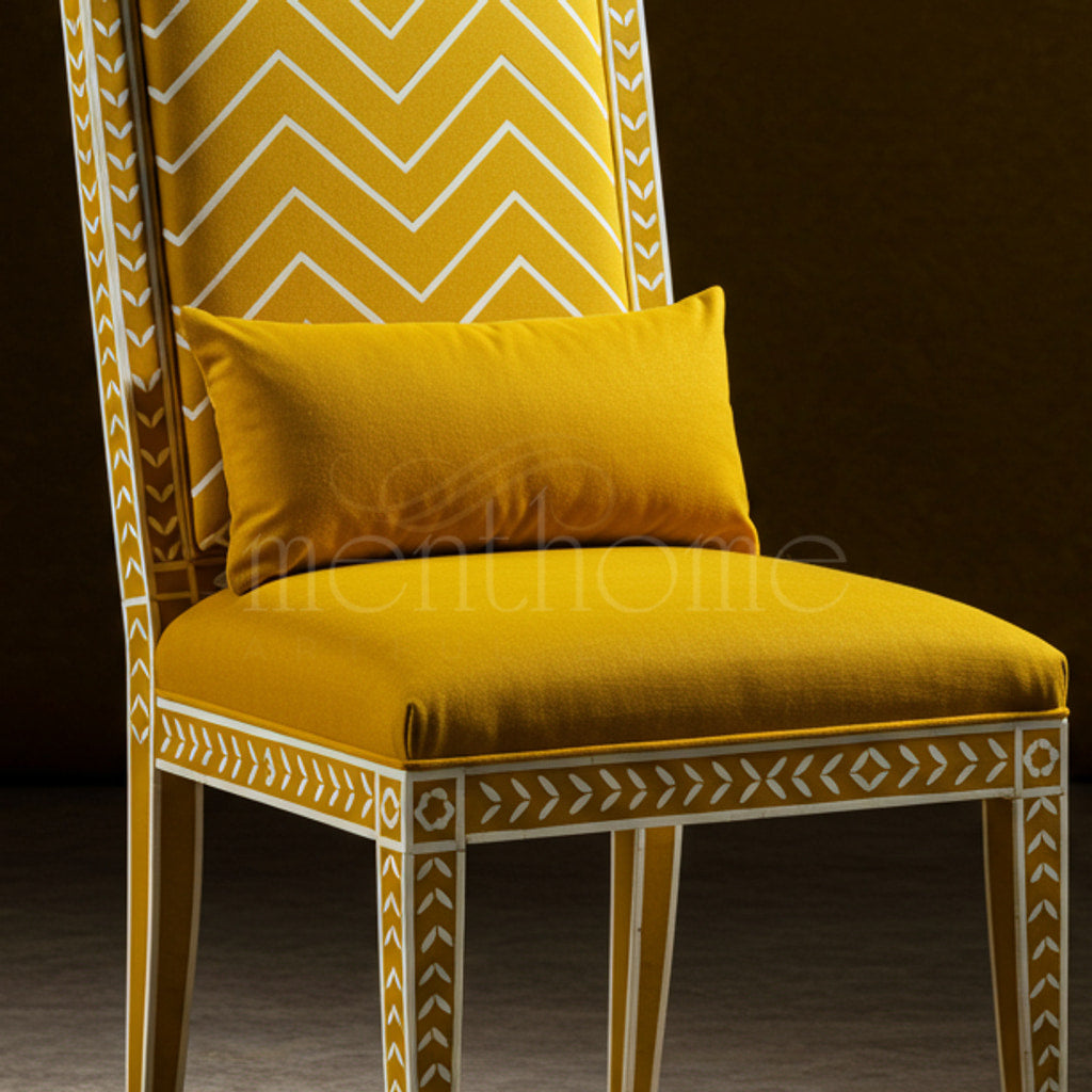 A sophisticated yellow accent chair featuring intricate white bone inlay patterns on a wooden frame. Upholstered with a soft, patterned fabric complemented by a matching lumbar cushion, this chair blends traditional craftsmanship with modern luxury.