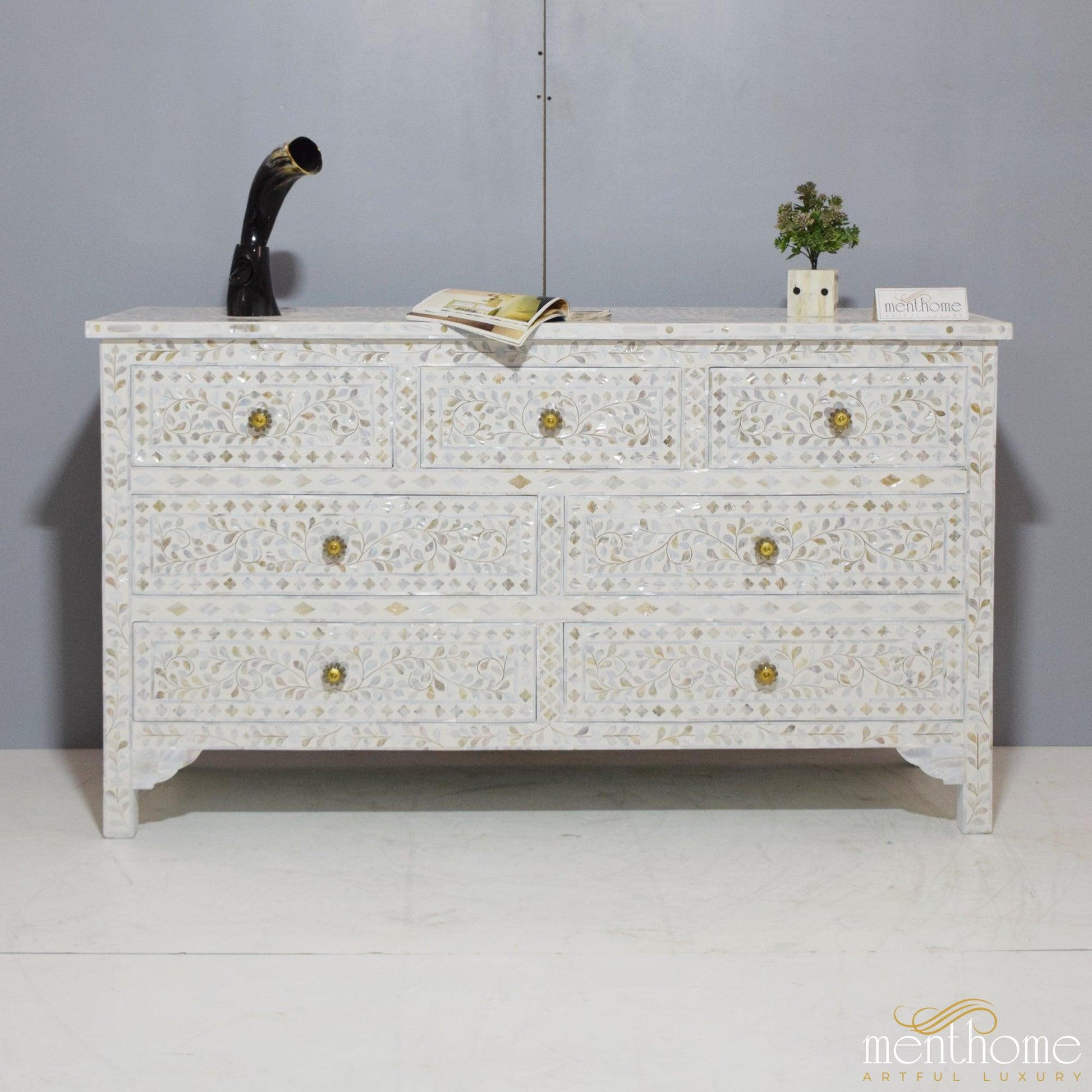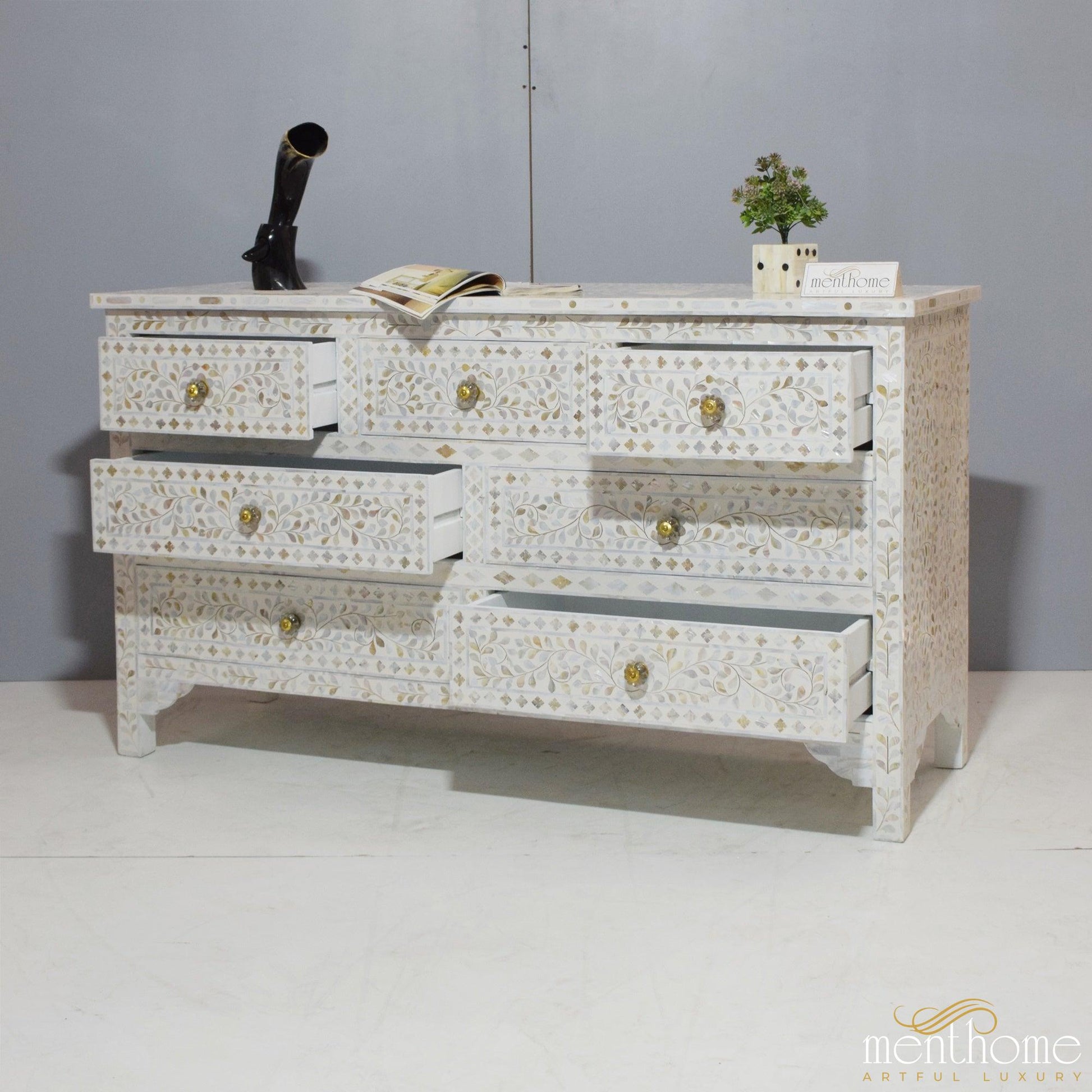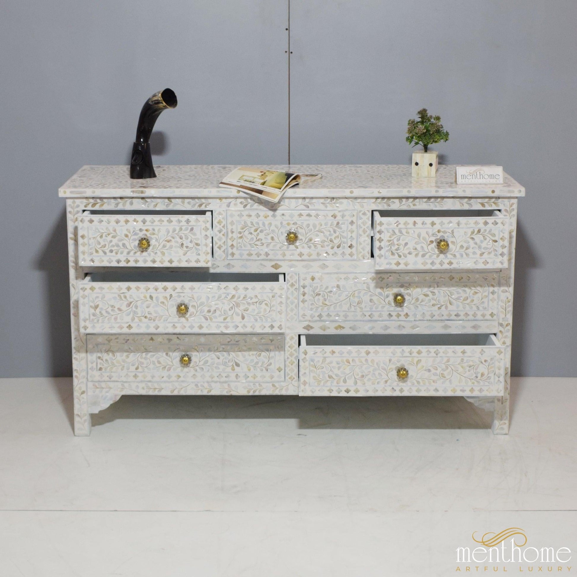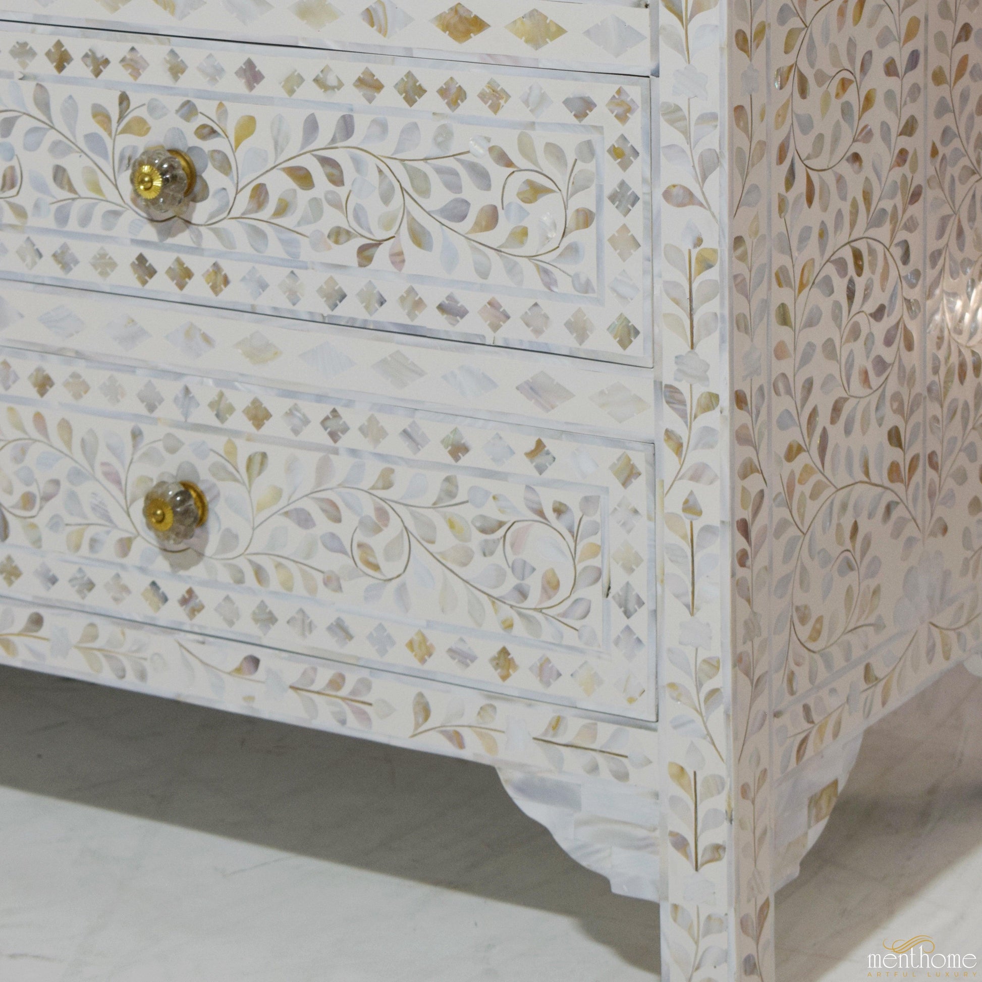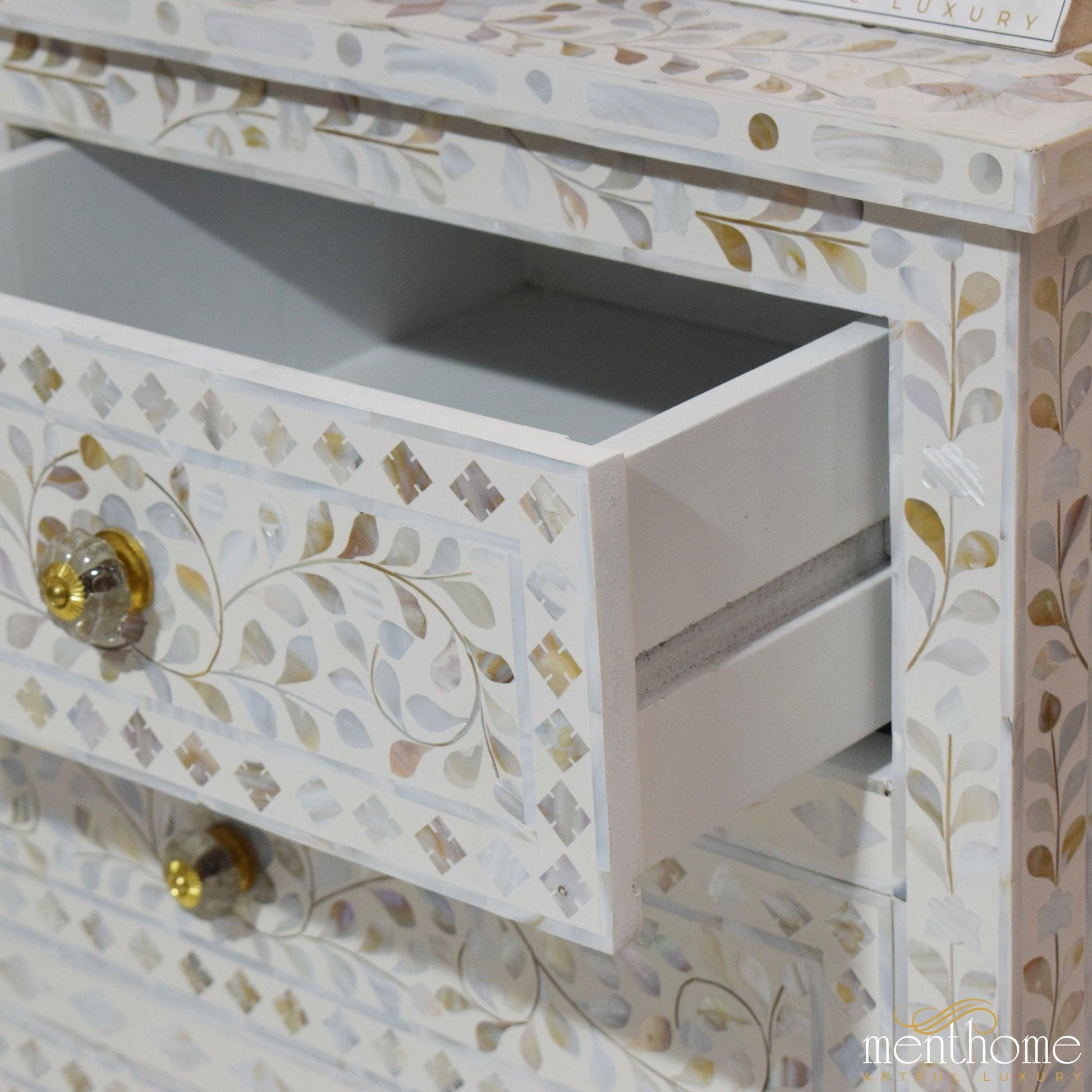 7抽屉珍珠母花卉图案白色梳妆台 | 奢华手工梳妆台