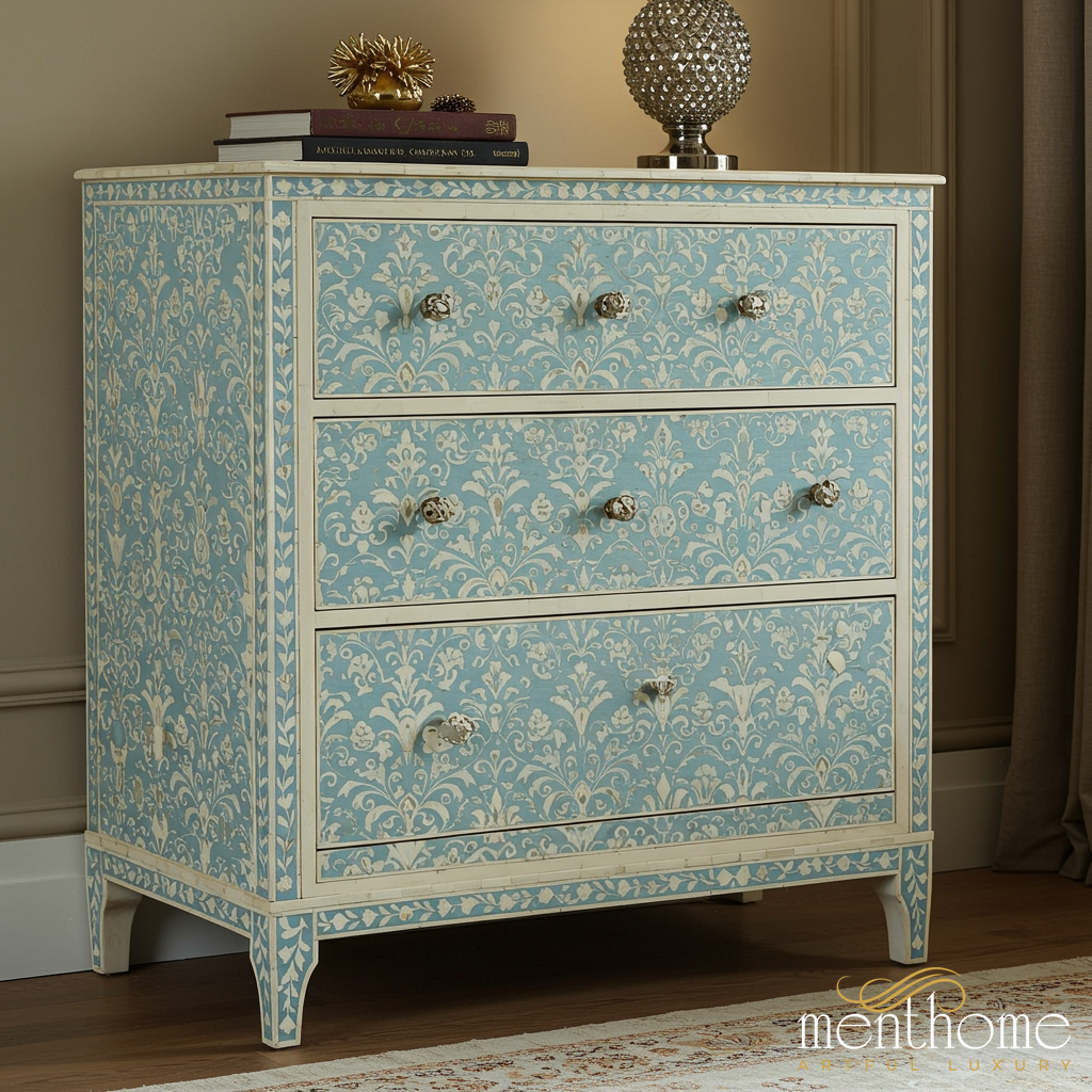 这款优雅的抽屉柜饰有手绘花卉图案,以舒缓的蓝色和奶油色为主色调,为任何房间增添一抹复古韵味。它配有三个宽敞的抽屉和装饰性拉钮,兼具实用性和装饰性。