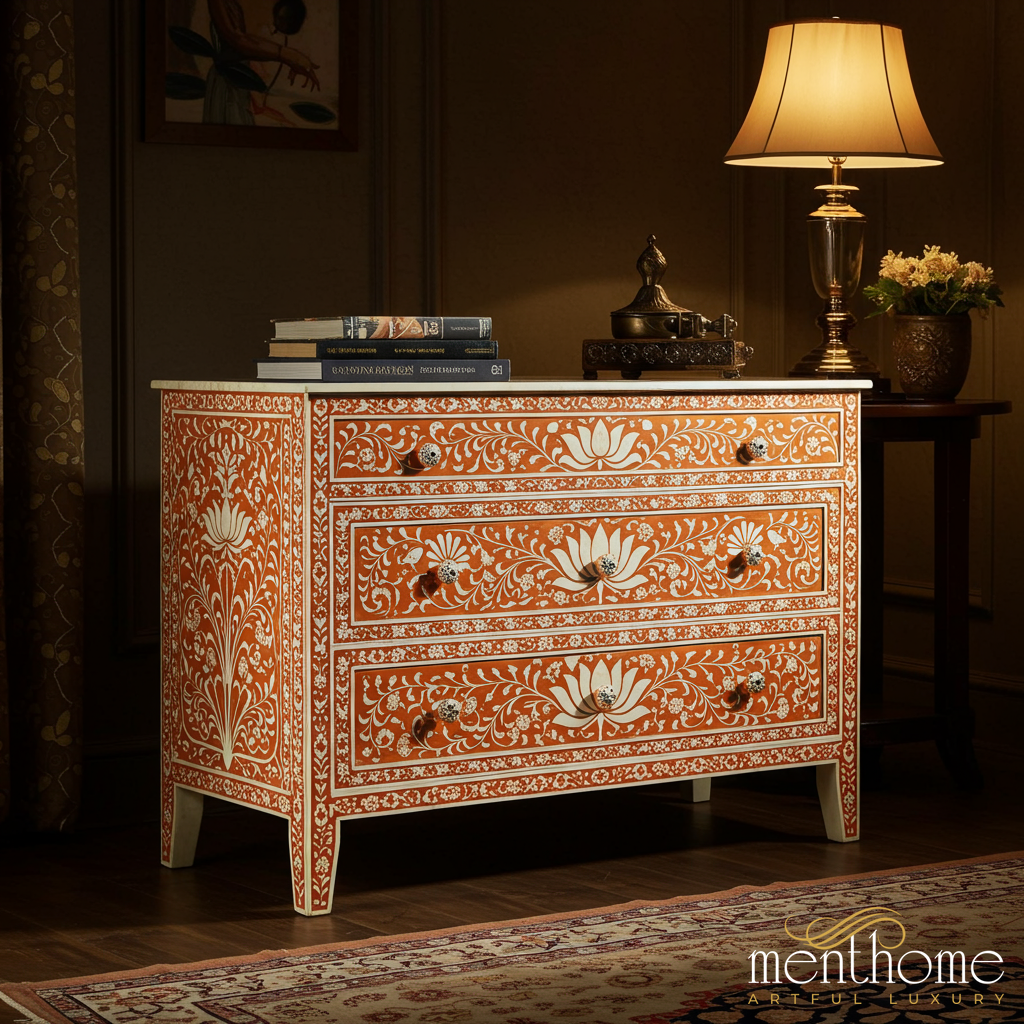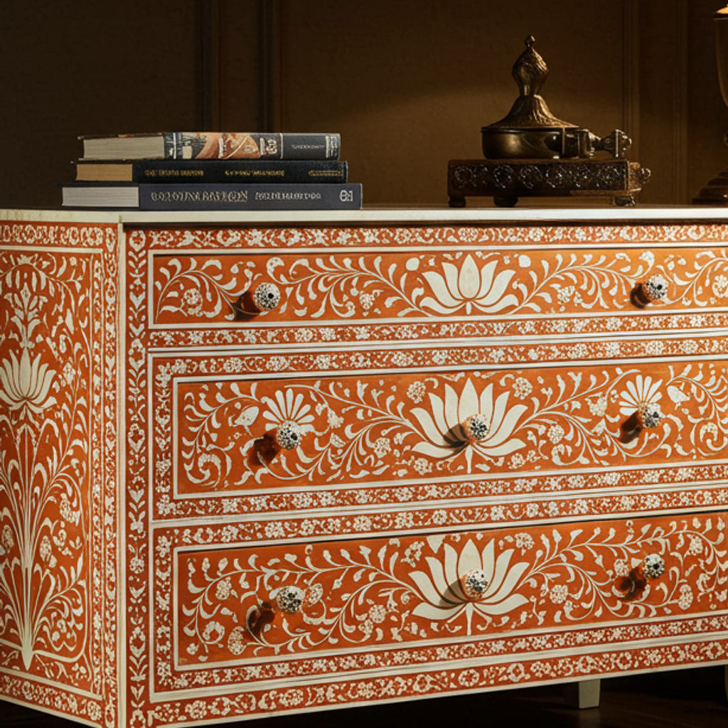 这款优雅的木质抽屉柜饰有精致的手绘花卉图案,色调温暖,为橙色和奶油色。它包含三个宽敞的抽屉,配有装饰性拉钮,既能为任何房间增添复古气息,又能提供实用的储物方案。