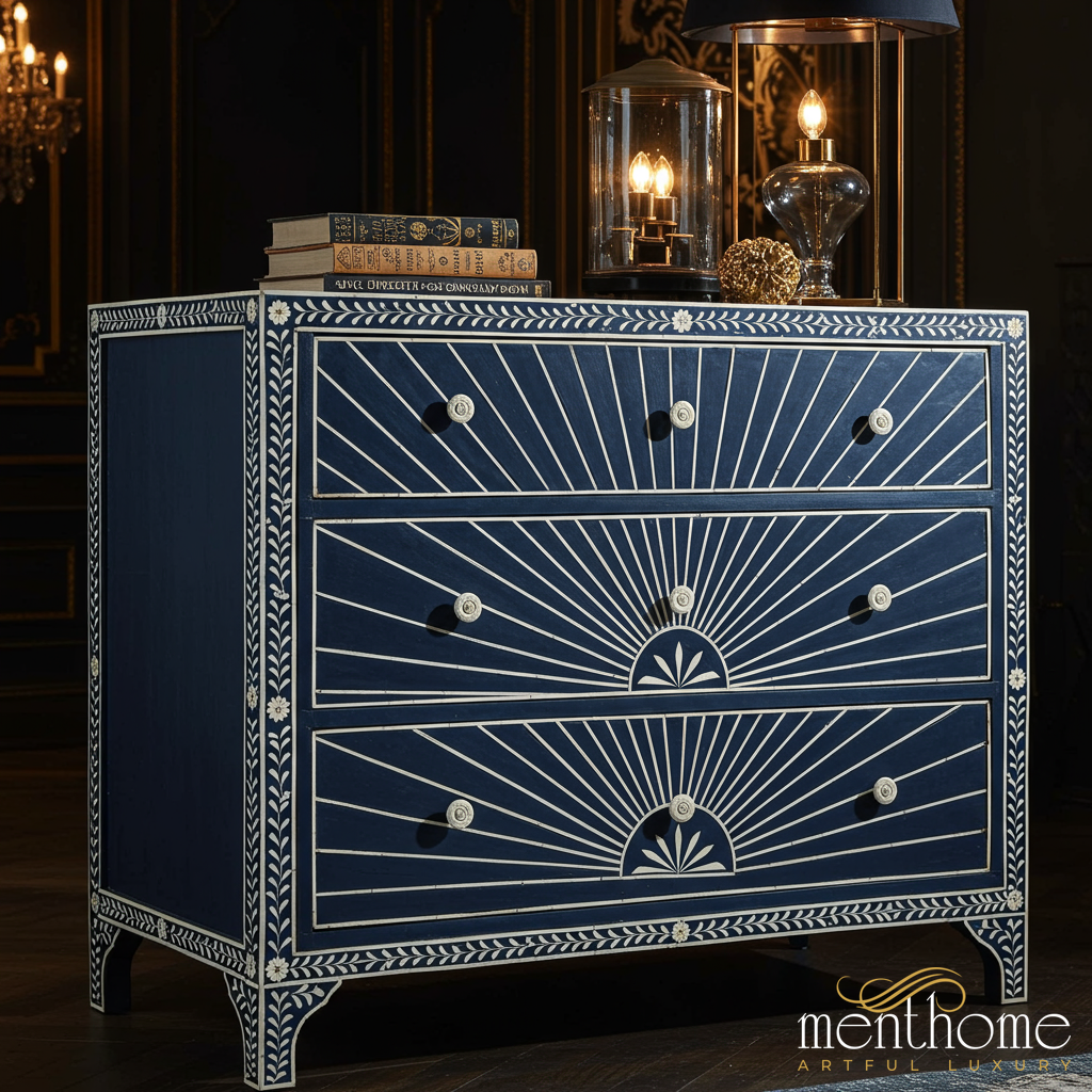 这款优雅的手工抽屉柜,采用醒目的深蓝色饰面,饰以精致的白色镶嵌图案。它拥有三个宽敞的抽屉,兼具实用性与手工设计,是任何追求复古魅力的客厅或卧室的完美之选。