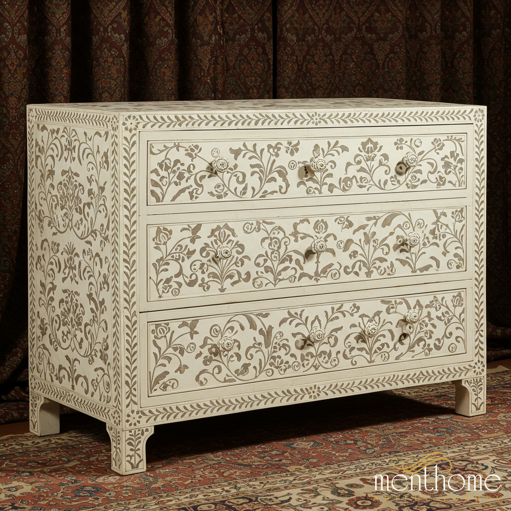 这款精致的抽屉柜,以传统的骨质镶嵌工艺,在洁白的底座上,饰以繁复的花卉图案。它包含三个宽敞的抽屉,每个抽屉都饰有精致的花卉图案和装饰性拉钮,将功能性与艺术性完美融合。