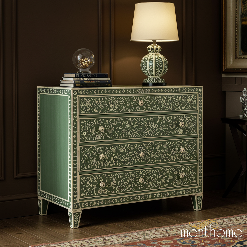 手工制作的绿色花卉镶嵌抽屉柜 | 奢华手工梳妆台