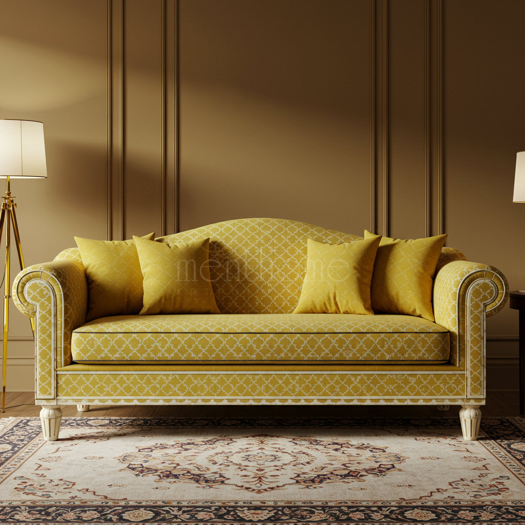 Elevate your living space with this exquisite yellow inlay sofa, featuring a timeless patterned upholstery and elegant detailing. Perfectly blending classic design with modern comfort, this sofa is a statement piece for sophisticated interiors.